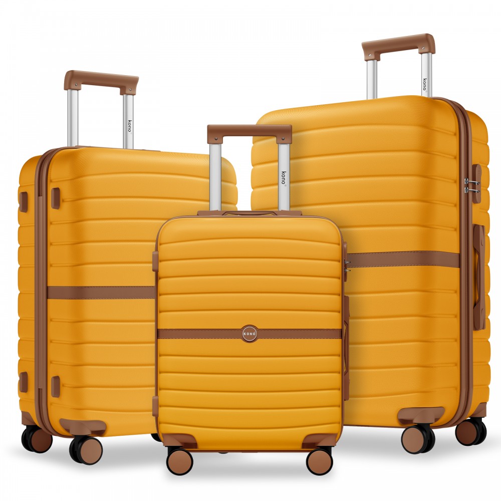 KSK2592 - Kono 3-teiliges Hartschalengepäckset aus ABS+PC mit Streifendesign und Farbblockdetails, mit Spinnerrädern - Gelb und braun