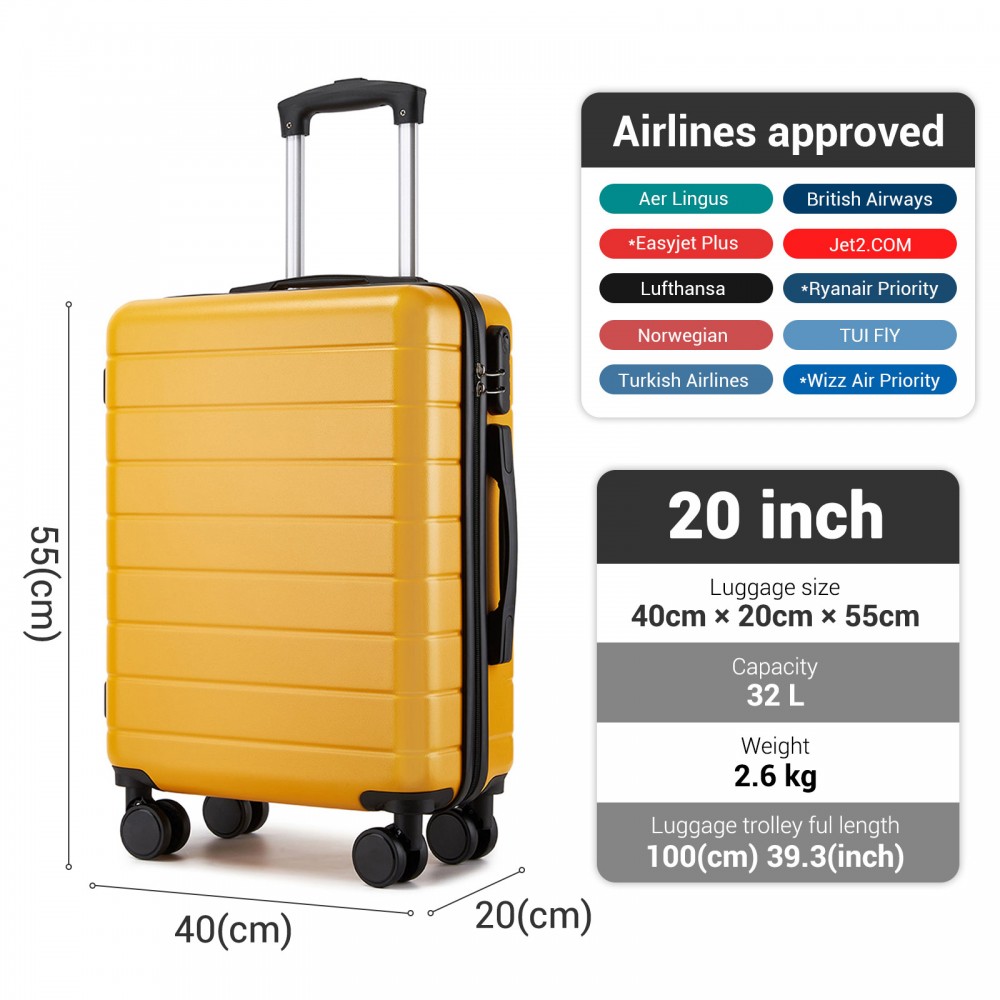 KSN2691 - 20 Zoll Handgepäckkoffer, leichter ABS-Hartschalenkoffer mit 360° lautlosen Rädern, Zahlenschloss und übersichtlichem Innenraum - Gelb