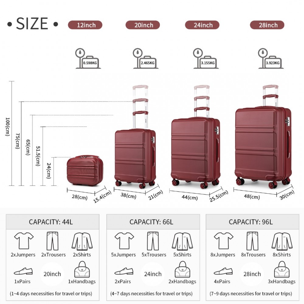 K1871-1L - Kono ABS Geformtes horizontales Design 4-teiliges Kofferset Mit Kosmetikkoffer - Rotwein