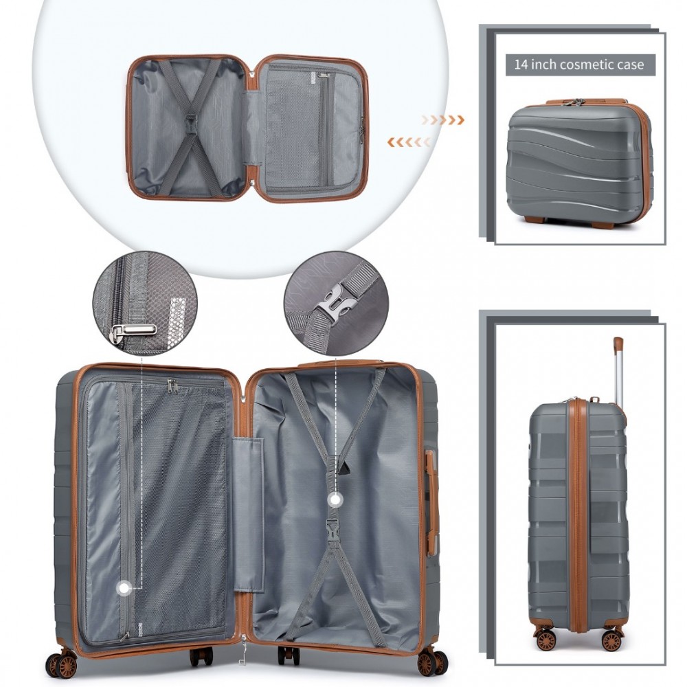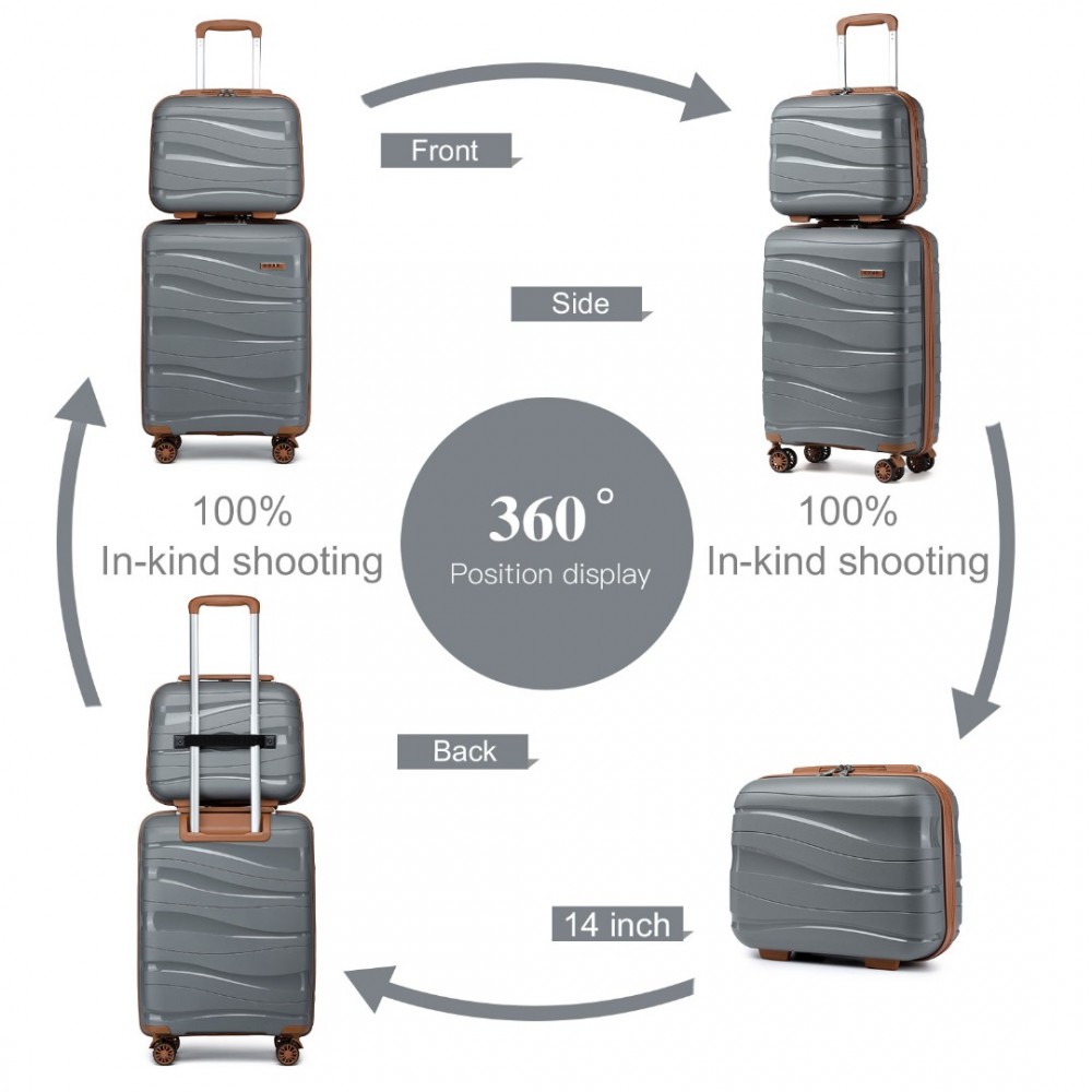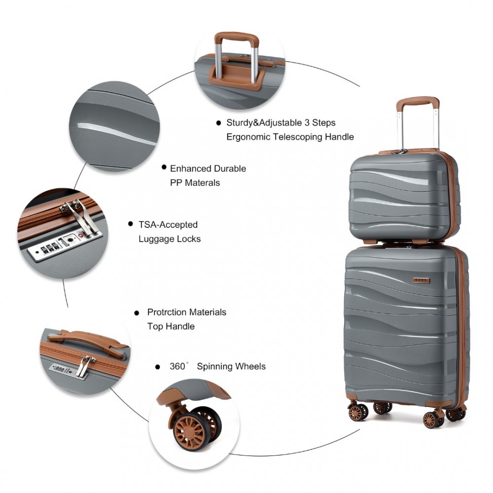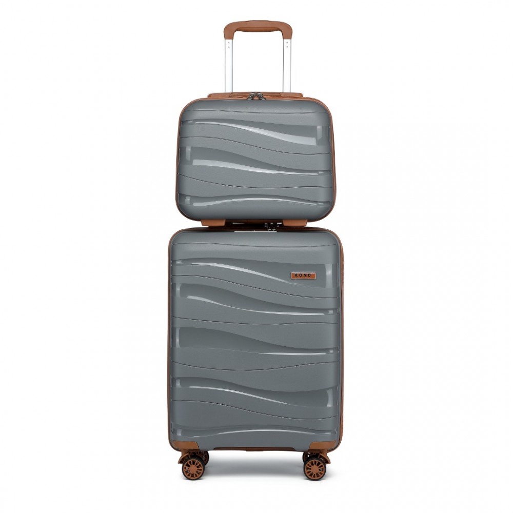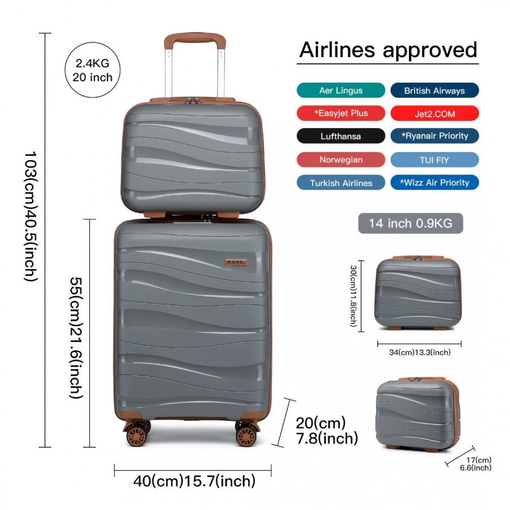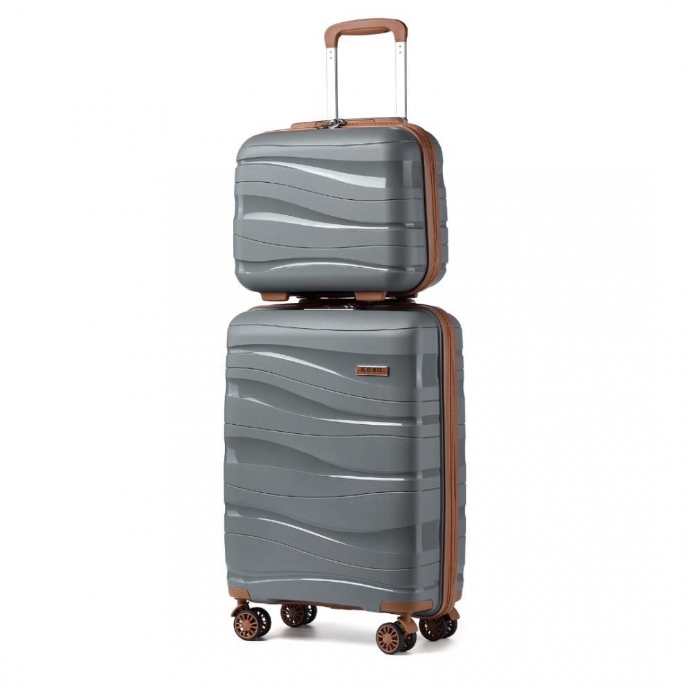 K2094L - Kono 14/20 Zoll leichtes Polypropylen-Hartschalen-2-teiliges Koffer-Set mit TSA-Schloss und Kosmetikkoffer - Grau und Braun