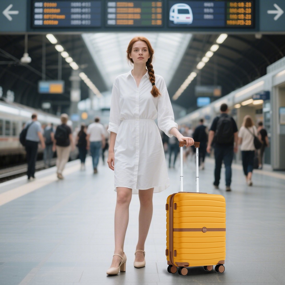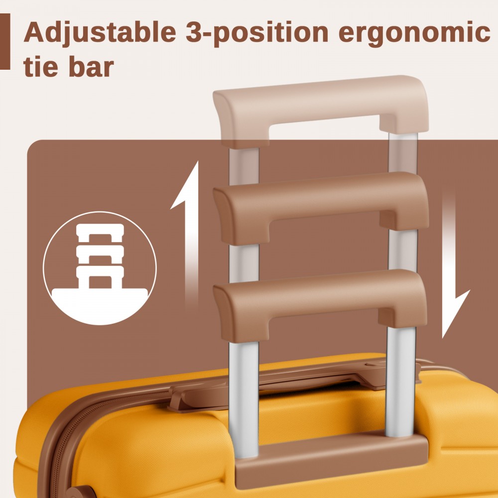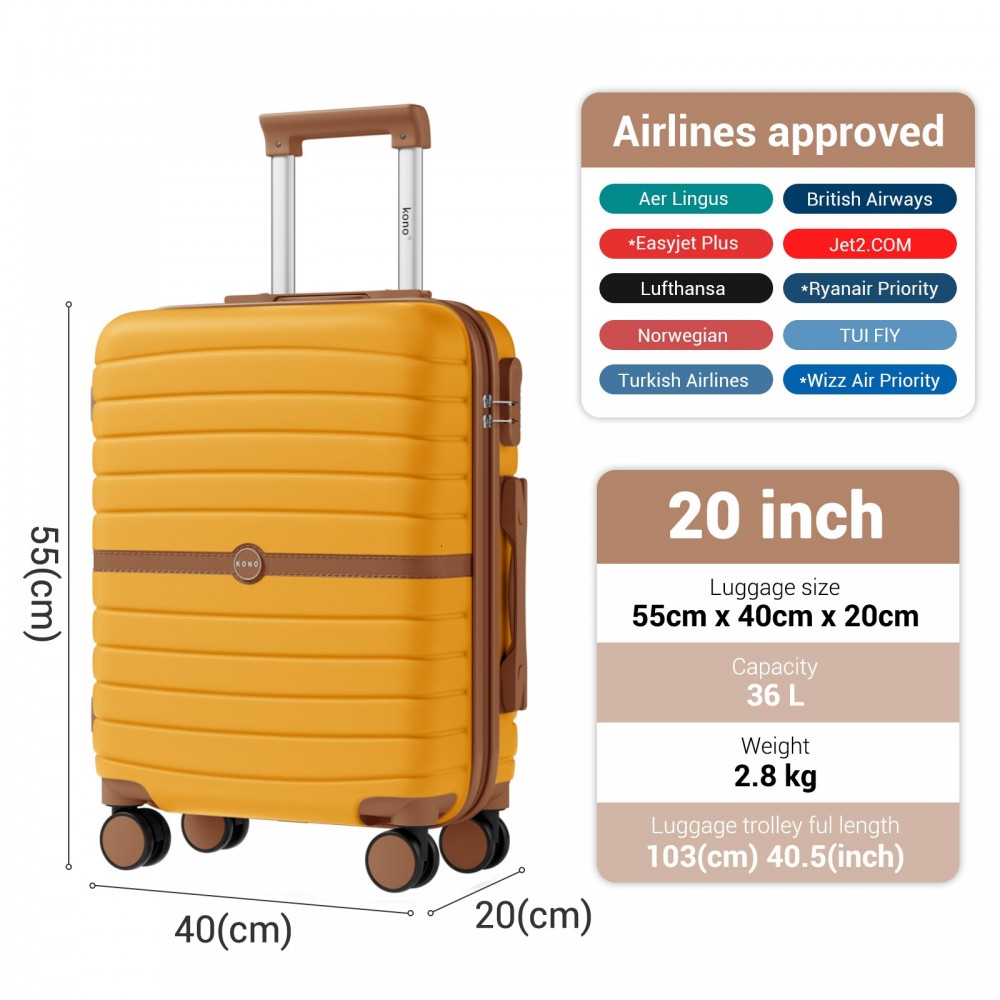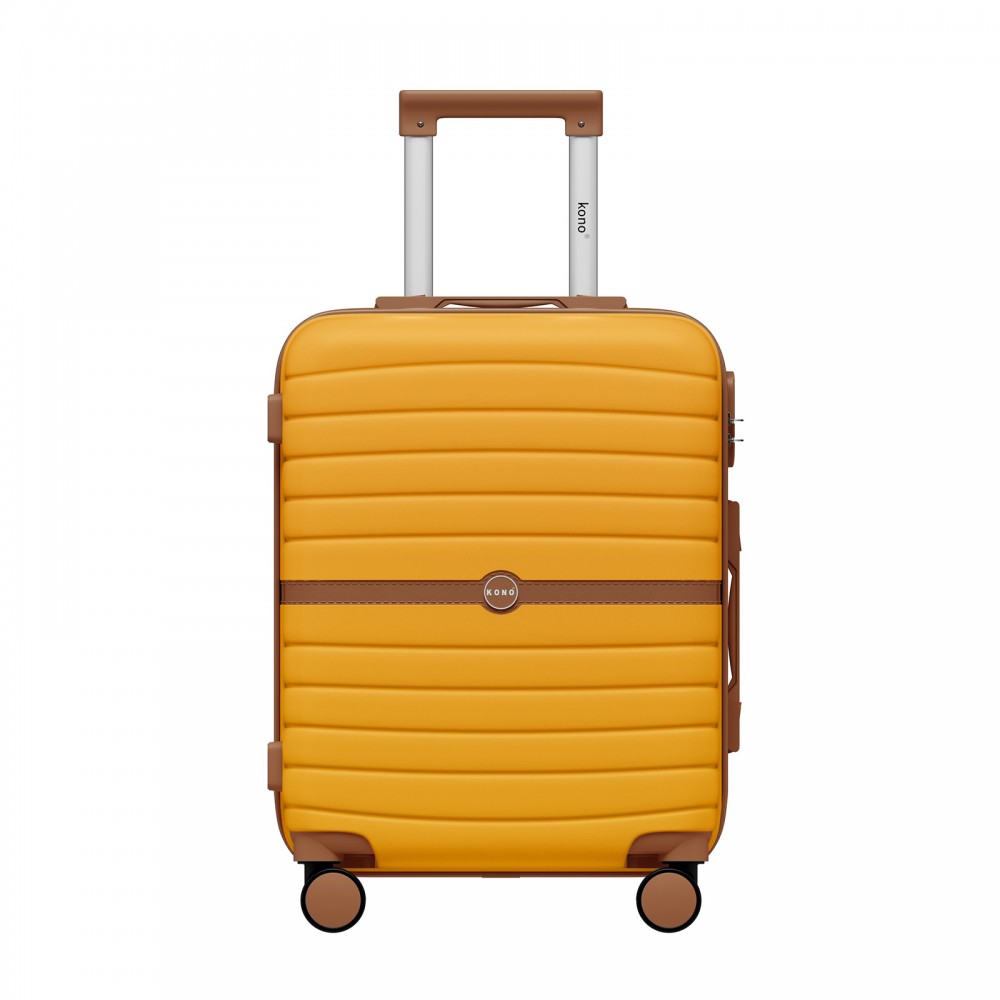 KSK2592 - Kono ABS+PC-Bordgepäckkoffer 20 Zoll mit Streifendesign und Farbblockdetails, mit geräuschlosen Spinnerrädern - Gelb und braun