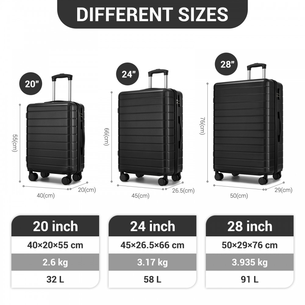 KSN2691 - 3‑teiliges Hartschalen-Kofferset (20/24/28 Zoll), leichte ABS-Koffer mit lautlosen Rädern und Zahlenschlössern - Schwarz