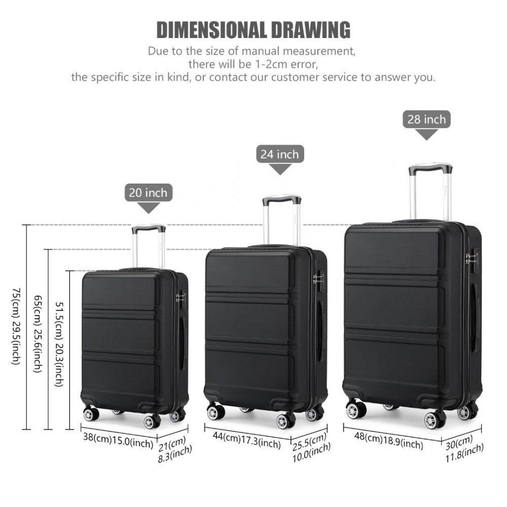 K1871-1L - Kono ABS Geformtes horizontales Design 3-teiliges Kofferset - Schwarz