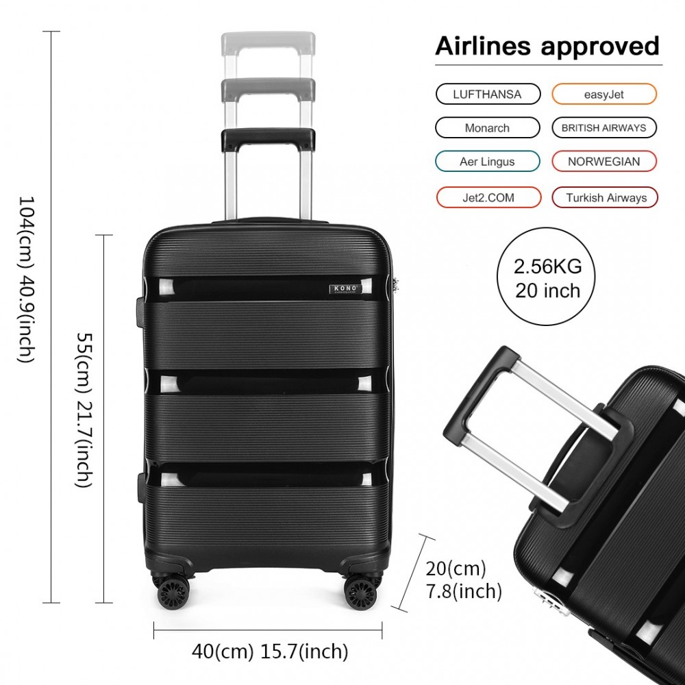 K2092L - Kono 20 Zoll Helles PP Hartschalen-Handgepäck in Kabinengröße - Schwarz