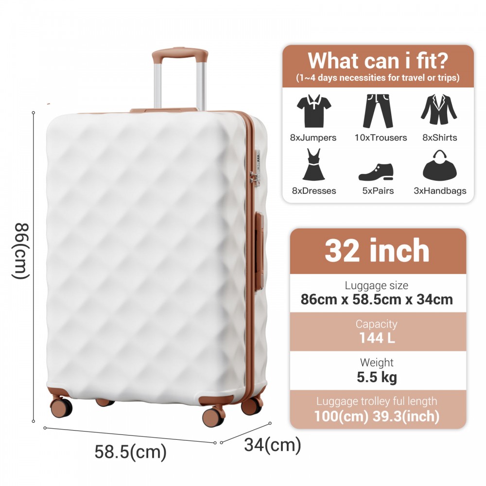 K2395L - British Traveller 32-Zoll Extra-Großer Hartschalen-Spinner mit Diamantstruktur aus ABS+PC und Teleskopgriff - Creme